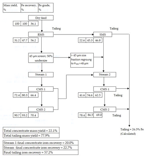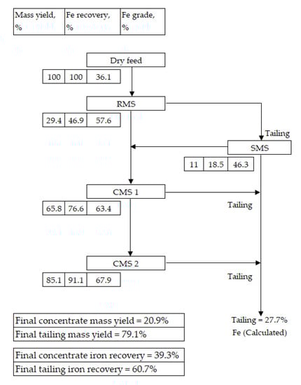 - The use of different flowsheet configurations has the potential to improve the performance of the PMS in terms of the early rejection of gangue particles and concentrate purity. For example, in Flowsheet 2, using a relatively coarse feed and introducing a classification unit into the beneficiation circuit resulted in the reduction of the amount of feed that required fine grinding, as in the case of Flowsheet 1. This also resulted in Flowsheet 2 generating concentrate with higher iron grades compared with Flowsheet 1.