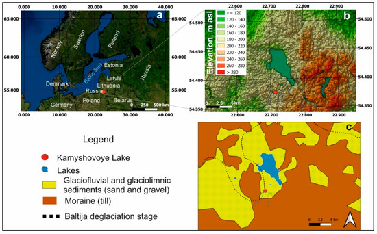 - Vaikutienė, G.; Stančikaitė, M.; Druzhinina, O.; Kublitsky, J.; Arslanov, K.H.; Subetto, D.; Uogintas, D. Palaeoenvironment of the SE Baltic region in Late Pleistocene and Holocene: Results of the paleolimnological study of Kamyshovoe Lake, Kaliningrad Region. In Proceedings of the INQUA Peribaltic Working Group Meeting and Excursion, from Past to Present—Late Pleistocene, Last Deglaciation and Modern Glaciers in the Centre of Northern Fennoscandia, Rovaniemi, Finland, 20–25 August 2017; pp. 165–166. [Google Scholar]