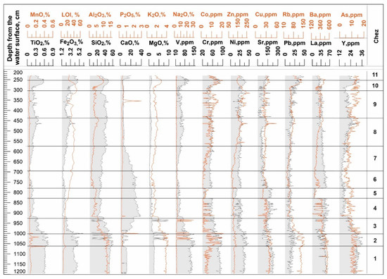 The lowermost zone, Chez 1 (1199–1061 cm, 14,900–12,800 cal y BP [6]), exhibited fairly stable concentrations for most of the elements and oxides analyzed. Terrigenous and the so-called weathering elements in this zone, including SiO2 (49–53%), Al2O3 (12.7–14.3%), K2O (2.8–3.2%), and TiO2 (0.7–0.8%), clearly predominated. The lowest part of the column of Chez 1 (1199–1061 cm) was represented by grey silty clay, while in the upper part of the zone, there was a thin layer of greenish-brown gyttja (1067–1061 cm). This interval was dominated by terrigenous-type sediments, which was confirmed by the LOI and F1 (Figure 3) of PCA. The lowest content of LOI (up to 4%) and SiO2/Al2O (up to 4%) indicate almost complete lack of productivity in the reservoir; diatoms were also not found in this part of the column [3,6]. However, some increase in productivity in the greenish-brown gyttja horizon occurred (1067–1061 cm), where the LOI reached 15%. The negative values of F2 indicate the predominance of oxic conditions. According to the age–depth model, the sedimentation in this interval took place during the Bølling–Allerød period, just after 15,000 cal y BP [6]. During this period, natural conditions were most likely uniform, contributing to a stable inflow of mineral fractions into the Kamyshovoye lake basin.