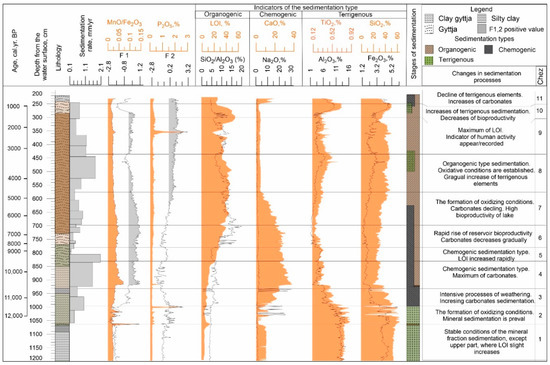 Under the conditions of modern climate change, paleogeographic studies are important for predicting the vectors of the development of natural conditions in the future. Lacustrine deposits are a universal material for studying paleoenvironmental changes because sediments preserve various bioindicators (i.e., pollen, diatoms, plant macrofossils, and chironomid capsules). The abiotic composition of bottom deposits can give reliable information about the surrounding catchment and physicochemical and biological processes [1]. A sufficiently large number of qualitative studies of vegetation changes during the Late Glacial and Holocene exist for the Kaliningrad Region, SE Baltic [2,3,4,5], which enabled us to carry out a comprehensive reconstruction of the natural conditions of the Kamyshovoye Lake surroundings during the Late Glacial to early Holocene transition [3,6]. This article presents the results of a geochemical analysis in combination with statistical processing, along with depth/age models for the entire core of the bottom sediments of the Kamyshovoye Lake (the Vishtynets Upland, Kaliningrad Region, Russia). The sedimentation processes in the Kamyshovoye Lake have been intensive and continuous since its formation (~15,000–16,000 cal y BP). The thickness of the deposits, at 9.79 m, made it possible to perform a study with high resolution. This study is important for understanding sedimentation processes and the factors that influenced their changes in the Late Glacial and Holocene.