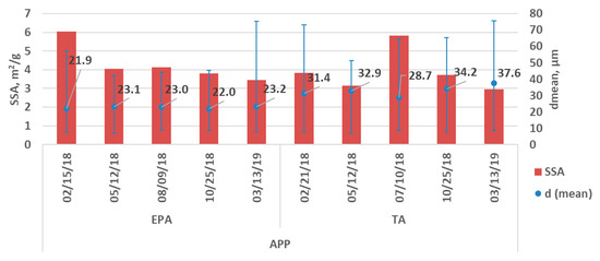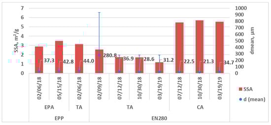 The BET specific surface area (SSA) and the mean particle size of the OSAs considered in this paper are summarized for APP (EPA, TA) in Figure 2, and for EPP (EPA, TA) and EN280 (TA, CA) in Figure 3. The variation of the physical properties is shown for different sampling dates. In case of APP OSA, EPA shows consistently finer particle sizes than TA, even though BET SSA fall within the same range. The EPP EPA and TA do not show this difference in particle size and are somewhat coarser (Appendix A: Table A1 and Table A2). The particle size of EN280-TA is coarser than EN280-CA and showed a correspondingly lower SSA.
