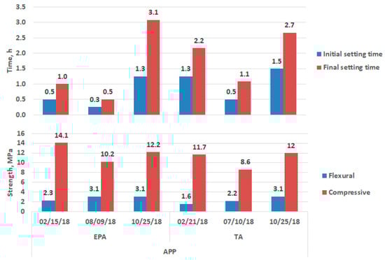 Self-cementing ability and setting times of the considered OSAs are shown in Figure 5 and Figure 6. The self-cementing ability is affected by the chemical composition and fineness of ashes, in particular the content of free CaO, portlandite, Ca/Mg silicates and SO3 [22,23]. The self-cementing ability of ashes with coarse particle sizes and lowest temperature of treatment is generally lowest. This is demonstrated for EN280-CA and TAs.