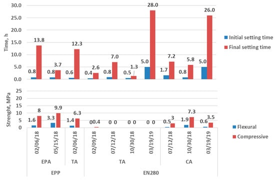 Setting times and self-cementitious ability for EPP (EPA, TA) and EN280 (TA, CA).