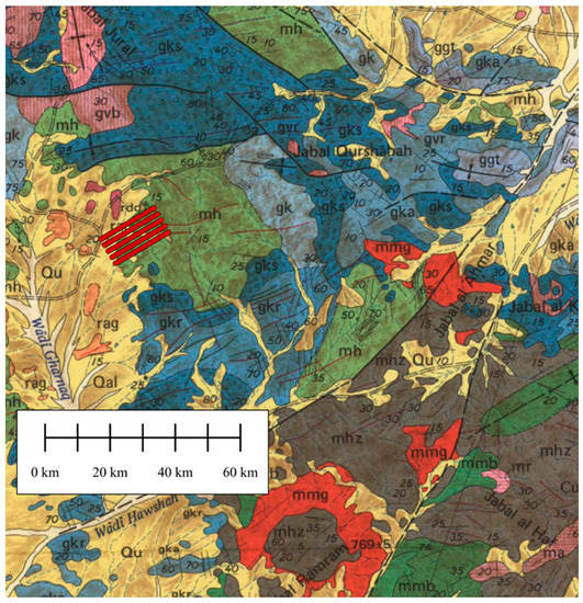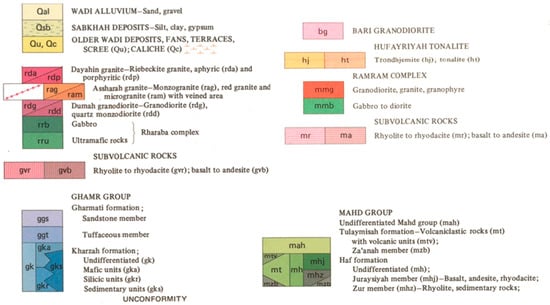 There are three distinct geologic regimes in the original study area (Figure 1 and Figure 2). The western most part contains Arabian shield with mountains up to 1 km high. The central part is formed by Cenozoic volcanic flows that are several hundred meters thick and underlain by the Arabian shield. Eruptions were recorded as recently as 1256 AD. The eastern part of the survey area is the focus of this study. It exhibits Arabian shield with sediment filled basins and hills hundreds of meters high. The Quaternary sediments in the areas are predominately alluvium, Aeolian sand, and slightly consolidated alluvium of old wadi deposits. There are many historic mines in the areas, including the largest mine in Saudi Arabia, the Mahd Ad Dahab (“Cradle of Gold”). A geologic map of the survey area is shown in Figure 1. The legend for this figure is shown in Figure 2.
