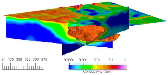 Conductivity volume of prospective target from the results of the airborne survey inversion. The cut-off shows conductivity greater than 0.05 S/m. The conductive overburden is shown in the near surface. The color map is conductivity in S/m, and the scale on the left shows distance in meters.