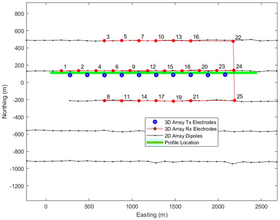 The second survey was very similar to the first one, but had three lines of receivers, and a single line of transmitting dipoles along the center line of receivers. Voltages were measured at each receiver potential electrode for every transmitter position, allowing a large number of combinations of off-line and on-line data points to be measured for each transmitter position. This survey layout is also shown in Figure 4.