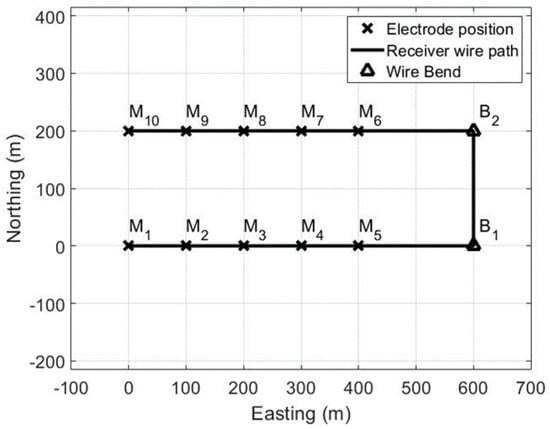 However, with modern distributed array systems, the electric field at a receiver midpoint multiplied by the dipole length may be a poor approximation to the actual measured voltage. For example, the voltage may be measured between two distinct points on the different lines (e.g., and as shown in Figure 5). It will be much more accurate to integrate the electric field along the wire paths to obtain the voltage as given by Equation (3) than to use a midpoint electric field approximation. The voltage for the receiver combination is thus synthesized for a measurement from electrode to electrode as follows: