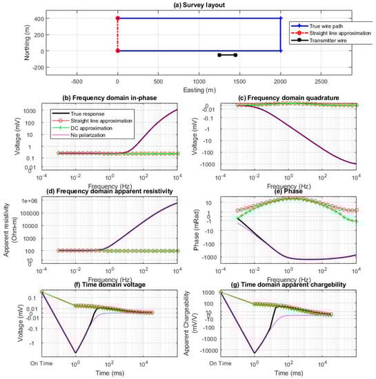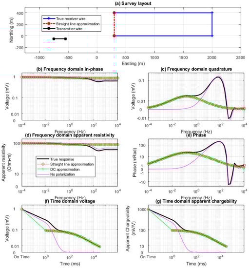 Frequency and time domain response with a non-conventional survey layout. Panel (a) shows the source–receiver layout. Note that, only active wires paths are shown and modeled. Panel (b) presents the frequency domain apparent resistivity. Panel (c) shows the frequency domain phase response. Panel (d) shows the frequency domain apparent resistivity and panel (e) shows the frequency domain phase. Panel (f) displays the time domain voltage decay. Panel (g) shows the apparent chargeability. The first tic on the time domain curve is the on-time channel.