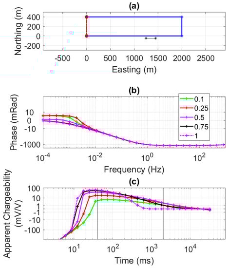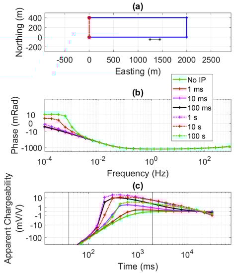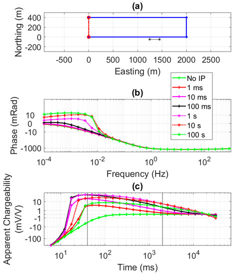 The modeling method to obtain the domain fields uses the integral equation method [], and our formulation includes the inductive coupling naturally. The modeling is based on the quasi-stationary (not static or DC) Maxwell’s equations. The IP effect is completely represented by modeling the conductivity as a frequency dependent and complex term. The modeling is done in the frequency domain and the results are transformed to the time domain with a cosine transform. The sources are modeled as an integration of current dipoles along the length of the transmitter wires. The receivers are modeled by integrating the electric fields along the path of the receiver wire. This modeling therefore includes inductive and capacitive coupling from the transmitting wires to the ground, the ground to the active receiving wires, and the transmitter wires directly to the receiving wires. Because of the very high impedance, we assume there is no feedback from the active receiving wires to the earth and back to the receiving wires, or from the passive wires to the active receiving wires. All filters in the instruments are included by applying them to the frequency spectrum before transforming the result to the time domain.