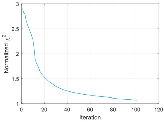 where indicates the data point or the error estimate of that point and is the absolute value of the ith data point. The data weights are the inverse values of these errors. The normalized at each iteration during the inversion is shown in Figure 11. The inversion converged from a normalized of around 3 to 1.1 at the 60th iteration, which was chosen to be optimal based on the noise level in the observed data, the flattening of the convergence curve, and examination of the resulting models. The optimal iteration is guided by theory but chosen by experience.