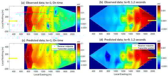 The field data collection was described in the previous sections. There is no standard plotting conversion for this type of distributed array data. We are plotting the physical fields to develop some intuition about the processes and to visually compare the observed and predicted data to analyze the data fit. Each image shows the voltage corresponding to one transmitter position. The plotting point is the average position of the two potential measurement points, as was shown in the synthetic example.