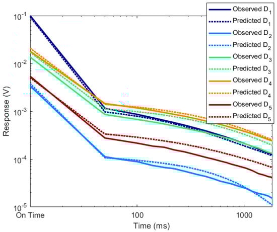 Examples of voltage decay from the on-time measurement to the latest time at 1.8 s. The solid line is the observed data, and the dotted line is the predicted data. D1 corresponds to the data from transmitter #1 and the receiver wire path from receiver #4 to #8; D2 is from transmitter #1 and the receiver path from receiver #5 to #7; D3 is from transmitter #9 and the receiver path from receiver #15 to #17; D4 is from transmitter #9 and the receiver path from receiver #15 to #10; and D5 is from transmitter #6 and the receiver path from receiver #5 to #7.