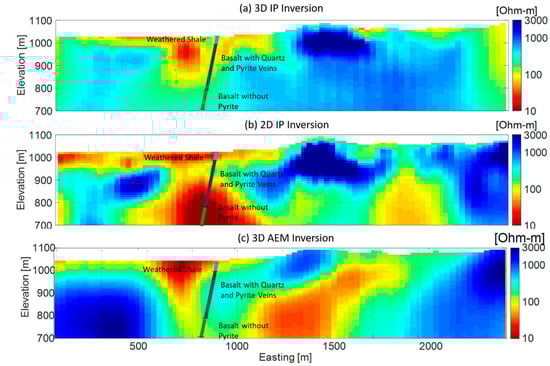 Inversion results under the center line of the 3D array, along the profile shown in Figure 4. The top panel (a) shows the resistivity recovered from the inversion of the distributed 3D array, the middle panel (b) shows the resistivity derived from the standard 2D dipole–dipole lines, and the bottom panel (c) shows the results from the Spectrum time domain airborne electromagnetic (TD AEM) data. The position of the borehole and preliminary qualitative estimates of the types of the rocks from the drilling are overlaid on the images.