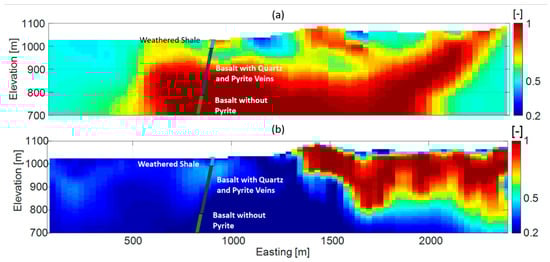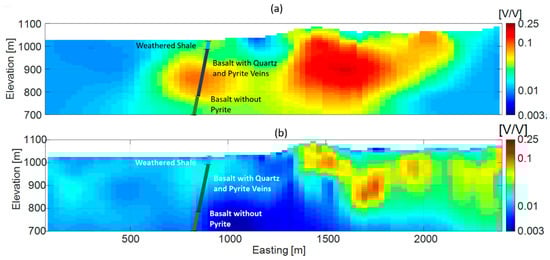 Inversion results of the chargeability under the center line of the 3D array, along the profile shown in Figure 4. The top panel (a) shows the results from the distributed array, and the bottom panel (b) shows the results from the 2D dipole–dipole lines. The position of the borehole and preliminary qualitative estimates of the types of the rocks from the drilling are overlaid on the images.