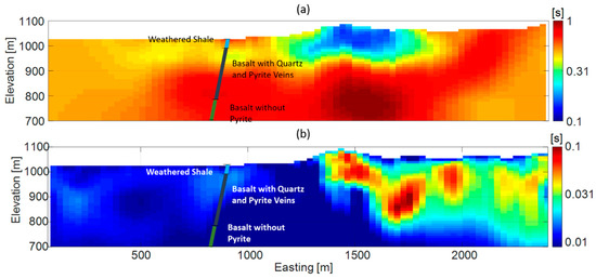 Inversion results of the times constant under the center line of the 3D array, along the profile shown in Figure 4. The top panel (a) shows the results from the distributed array, and the bottom panel (b) shows the results from the 2D dipole–dipole lines.