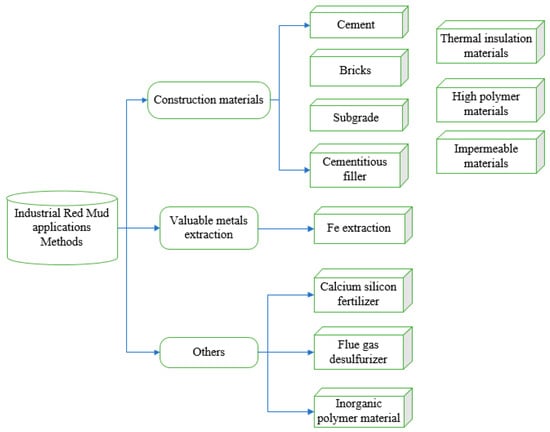 Many achievements for RM harmless utilization have been obtained during the past several years. However, most of these achievements were only in the laboratory stage, which may be due to there being some non-negligible problems. Problems such as a high cost of raw material, safety and environmental issues, low public acceptance and limited market made only a small number of researches successfully achieved industrialization (such as cement and subgrade [42,43]). This paper focused on the industrial utilization methods of RM in different regions in the past 60 years, which are shown in Figure 3. Moreover, some recent industrial progresses were also introduced.