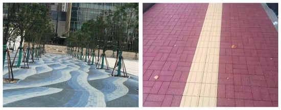 RM permeable brick belongs to another patent technology of RM sintered brick [74]. The technology solves the problem of the dissolution of alkali metals and heavy metals in RM, so that RM can be safely used as raw material in permeable pavement materials, and the comprehensive utilization rate of RM waste residue can reach 50–70%. In 2018, a company in Shandong province built a fully automatic production line of ecological RM permeable brick with a daily output of 3000 square meters, which can digest nearly 100,000 t of RM every year, and the addition ratio of RM reached 80%. The thickness of RM permeable brick is 3.5 cm, and the bending strength of RM brick reached 6–8 MPa when the national standard is 3.2 MPa. Radioactivity, heavy metal dissolution and other indicators met the requirements of building materials according to GB 6566-2010. Moreover, RM brick has excellent performance in terms of water permeability, anti-freezing and thawing, and anti-sliding property [42]. Economically, the price of RM brick was the same as that of clay brick. Until now, the brick has been widely used in pavement laying (Figure 5), greatly improving pavement permeability, anti-sliding and noise reduction.