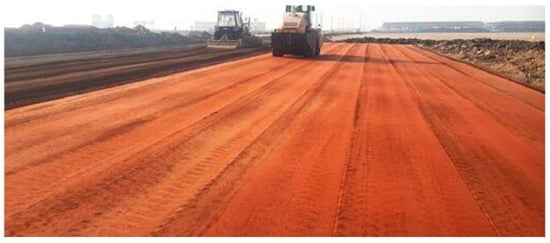 Shandong Aluminum Company built a 4-km-long RM roadbed demonstration section in 2015 (as seen in Figure 6), which used sintering RM, fly ash and lime as the main raw materials and the ratio was 75%:15%:10% (dry mass ratio). The 7 and 28 day average compressive strength reached 1.2 and 3 MPa, which met the strength requirements of grade-I lime-stabilized soil and highway [81]. This was the first sintering RM pavement base project applied in the actual highway in China, which consumed more than 20,000 t of sintering RM. It was one of the projects with the largest utilization amounts of RM in recent years and has been in normal use until now [82]. In 2008, the company provided the same formula and cooperated with local municipal highway bureau to build a road with 500 m long and 27 m wide, consuming nearly 4000 t of sintering RM. Actual practices showed that the whole test section was in good operation and basically qualified with national standards. [83]. The 7 and 28 day compressive strength reached 1.96 and 2.6 MPa, which met the strength requirements of the first grade of the stable soil layer of lime and the expressway. Economically, the construction cost of RM base was 10–20 Yuan cheaper than several common base materials, such as limestone soil and lime-ash gravel, under the same transportation distance [84].