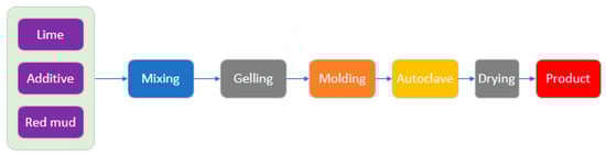 Using RM to replace diatomite and combining it with lime, bentonite and admixture, Shandong aluminum plant successfully developed RM micro-porous calcium silicate insulation material. The addition ratio of RM reached 30%, and the production process and physical properties of the product are shown in Figure 8 and Table 5. Its mechanical properties were excellent (the density was 215 kg/cm3, the flexural and compressive strength reached 0.31 and 0.91 MPa, the thermal conductivity was 0.0554 W/(m·K), and the maxing affordable temperature was up to 650 °C), fully meeting the relevant national standards [91]. The product was put into industrial production in 2001, and the production line of calcium silicate insulation material with an annual output of 12,000 m3 was built. Practical practices showed that the production line process stability, product quality and economic benefits were good [91].