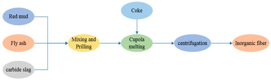 The chemical compositions of inorganic fiber belong to SiO2-A12O3-CaO-MgO system, and RM contains oxides required by inorganic fiber, which could be used to produce inorganic fiber by adding fly ash, carbide slag, blast furnace slag and other solid wastes [92]. A company in Henan province has successfully produced qualified inorganic fiber by mixing RM, fly ash and calcium carbide slag on an industrial scale, and the ratio of RM, fly ash and carbide slag was 35–40%:23–28%:32–37%. The flow chart of the industrial preparation method and the chemical composition of RM inorganic fiber were shown in Figure 9 and Table 6. The thermal resistance of fiberboard with a density of 70 kg/m3 was 2.21 (m2∙K∙w−1), and the fiber formation rate reached about 80% [92].