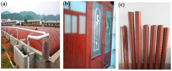 Various RM plastic used in different areas ((a) biogas fermentation tank; (b) plank; (c) pipe).