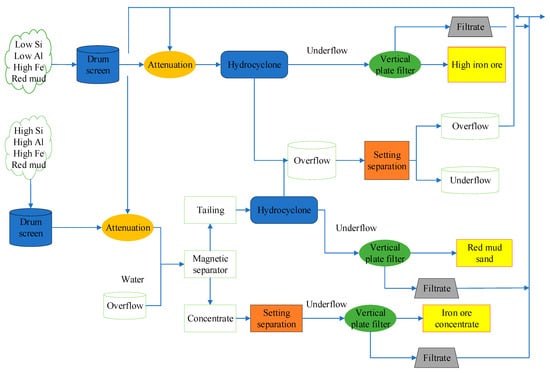 Aiming at Bayer RM from Indonesia bauxite, Shandong Aluminum Company successfully developed Fe extraction technology using cyclones and pulse high-gradient magnetic machines in 2008. The company divided Bayer RM into two types, one was RM with low Si and Al, and high Fe, and another was RM with high Si, Al and Fe. For different types of RM, different ways of the Fe extraction method were carried out, which has been shown in Figure 11. The company adopted a desands process for the former, the content of Fe2O3 in RM sand was enriched to about 68.33% by separating 58% tailing using cyclone. The company adopted the process of selecting iron first and desanding later for the latter. The content of Fe2O3 in the iron powder was 65–75% with an output rate of about 40%, and the iron powder could be used as raw material in the steel industry. While producing iron powder, high iron RM with the content of Fe2O3 up to 55% was also produced, which can be used as raw material for cement production and an ideal ore for iron powder [110]. The chemical compositions of iron powder and high iron RM are shown in Table 7. In 2009, a production line with an annual consumption of 400,000 t was built, which could produce 80,000 t of iron powder per year. The discharge of RM has been greatly reduced with a reduction rate of 40%, which can reduce the RM storage and maintenance cost of 6.5 million Yuan per year.