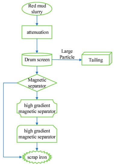 Whether RM is generated from imported bauxite or bauxite in Guangxi province, it contains a large number of Fe2O3 and is mainly in the form of hematite [54]. Hematite is weakly magnetic and can be directly enriched and recovered through strong magnetic separation, which can create some value and reduce the amount of discharged RM.