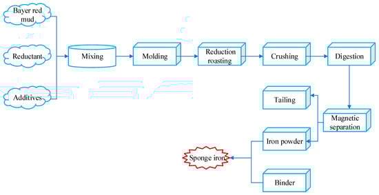 - Gao, J.; Chen, Y.; Zheng, X. Analysis of factors affecting the preparation of sponge iron from red mud by bayer process. Shandong Metall. 2010, 32, 37–40. (In Chinese) [Google Scholar]
