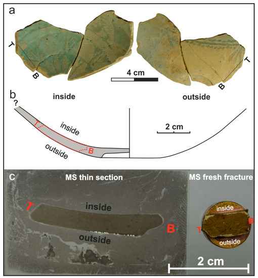 The multiproxy analysis began with the macroscopic observations of the bowl: glaze and body on the vessel walls and on the fracture (Figure S1). Microstructural analysis with the application of microscopic techniques required the preparation of a fresh fracture and a thin section from the vessel fragment. Microscopic observations were performed in a cross-section perpendicular to the vessel wall. The inside wall surface is located towards the upper margin in the presented images. MS samples (MS thin section and MS fresh fracture) were prepared from a fragment cut out from the faience bowl (Figure 2b,c). Additional preparation was made from the separated fragments of the faience layered structures, and the remaining chips were subdivided into individual samples for the planned analyses.