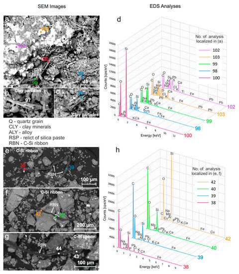 The body also contains relicts after the firing process in the form of elongated carbon–silicon ribbons (compare Figure S2b,d with Figure 6e–g, C-Si ribbon (RBN)). Their length reaches maximally several hundred micrometres and width does not exceed 10 µm. The ribbons are primarily composed of carbon and silicon. Analysis No. 38 shows also the low content of other elements such as sodium, potassium and calcium, which stands out from the rest of the analyses (compare Figure 6h with Table S1).