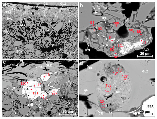 The glaze layer contains oval aggregates about 50 µm in size (light to dark grey in colour; Figure 7c,d, RS). The aggregates are inhomogeneous, and have a sharp contact with the glaze in some cases and a blurry contact in others.
