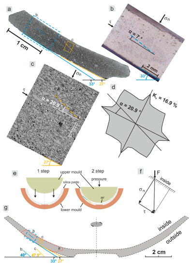 Elongated and angular quartz grains observed macroscopically were confirmed in petrological observations. The lack of rounded grains excludes the use of sand deposits as raw material. Good sorting points to the selection of the material during the preparation of the mixture. The distinct orientation of the elongated grains as well as the flattening of pores indicate moulding of the object through compression. The variable density of the silica paste and the changing orientation of elongated grains may suggest moulding with a still lower part and a moveable upper part. The uneven clamp during bowl moulding and its bent shape resulted in a variable state of stress and strain in the material caused by the activity of compressive and tensile forces.