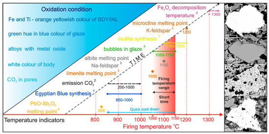 The complex chemical composition of the body alloys points to the fact that before firing the admixtures in the body layer contained large amounts of clay minerals, e.g., derived from the silty clay sediments of the Nile River (Figure 6c,d). Their presence in the body confirms the application of clay admixtures to improve the plastic properties of the silica paste during moulding. Such admixture maintained also the durability and hardness after the drying of the moulded object. The application of clay to reinforce the structural bonds between the grains may point to a single firing stage. In turn, the preserved plates of clay minerals may aid in the reconstruction of the firing temperature.