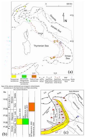 - Guerrera, F.; Martín-Martín, M.; Raffaelli, G.; Tramontana, M. The Early Miocene “Bisciaro volcaniclastic event” (northern Apennines, Italy): A key study for the geodynamic evolution of the central-western Mediterranean. Int. J. Earth Sci. 2015, 104, 1083–1106. [Google Scholar] [CrossRef]