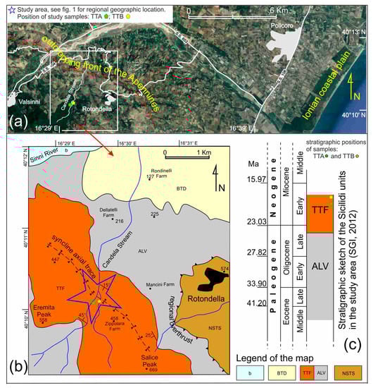 - Carbone, S. Note illustrative Foglio 523 Rotondella, Carta Geologica d’Italia, 1:50.000 2013. ISPRA. Available online: https://www.isprambiente.gov.it/Media/carg/note_illustrative/523_Rotondella.pdf (accessed on 1 January 2013).
