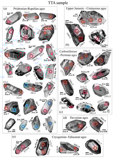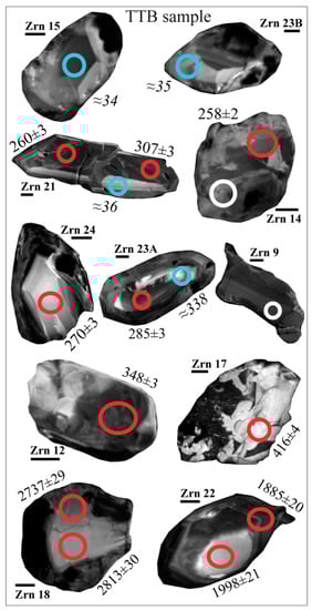 - Corfu, F.; Hanchar, J.M.; Hoskin, P.W.O.; Kinny, P. Atlas of zircon textures. In Zircon; Hanchar, J.M., Hoskin, P.W.O., Eds.; Reviews in Mineralogy and Geochemistry: Washington, DC, USA, 2003; pp. 469–500. [Google Scholar]
