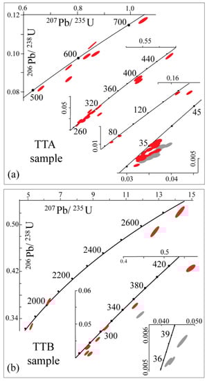 - Malusà, M.G.; Carter, A.; Limoncelli, M.; Villa, I.; Garzanti, E. Bias in detrital zircon geochronology and thermochronometry. Chem. Geol. 2013, 359, 90–170. [Google Scholar] [CrossRef]