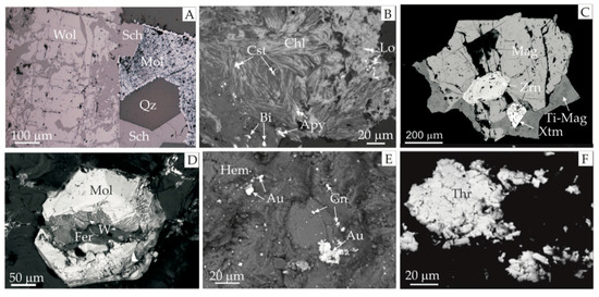Photomicrographs of ore mineralization from the Szklarska Poręba Huta (A–C) and Michałowice quarries (D–F). (A) Replacement of wolframite (Wol, hübnerite) by scheelite (Sch) and molybdenite (Mol) by Mo-ochres forming aggregates up to 5 mm in diameter in a quartz (Qz) veinlet. Reflected light; (B) finely crystalline cassiterite (Cst) in association with chlorite minerals (Chl), native bismuth (Bi), arsenopyrite (Apy) and löllingite (Lo). BSEI (Backscattered Electron Image); (C) titanium-bearing magnetite (Ti-Mag) and magnetite (Mag) in association with zircon (Zrn) and xenotime (Xtm). BSEI; (D) Molybdenite (Mol) hexagonal tablets with ferberite (Fer) and secondary tungsten minerals (W), BSEI; (E) Native gold grains (Au) in paragenetic association with hematite (Hem) and galena (Gn). BSEI; (F) Thorite (Thr) in the form of fine crystalline aggregates associated with hematite. BSEI.