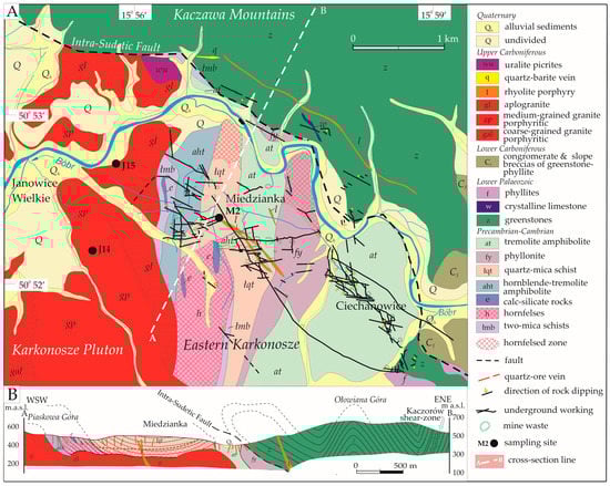 Geological sketch map with sampling sites (A) after [66] with mine workings and waste compiled from unpublished mining documents. (B) Geological cross-section of the Miedzianka deposit and its surroundings after [66].