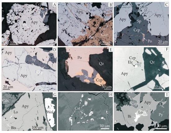 (A–F) Photomicrographs under reflected light of ore mineralization from the Miedzianka Cu(-U) deposit. (A) Characteristic poikilitic texture of arsenopyrite (Apy) and rare inclusions of pyrrhotite (Po) and ore-free minerals and sphalerite overgrowths (Sp); (B–D) Common features of the ore mineralization from the Eastern Karkonosze are fractured arsenopyrite (Apy) aggregates overprinted by base metal sulfides, e.g., mainly by chalcopyrite (Ccp) in association with sphalerite (Sp) and pyrrhotite (Po); (E) Overgrowths of pyrrhotite (Po) by chalcopyrite (Ccp) with sphalerite (Sp) and quartz (Qz); (F) Fine electrum (Elc) and chalcopyrite (Ccp) intergrowths in fractured arsenopyrite (Apy) massive ore cemented by quartz (Qz); (G) wolframite (Wol) (ferberite: WO3—77.8 wt.%; FeO—21.2 wt.%; MnO—0.4 wt.%) in association with arsenopyrite (Apy) and goethite (Gth). In arsenopyrite fine inserts of bismuthinite (Bis) and löllingite (Lo); (H) disseminated fine xenomorphic crystals of cassiterite (Cst); (I) intergrowths of arsenopyrite (Apy) with pyrite (Py) and chalcopyrite (Ccp). Arsenopyrite contains finely disseminated intergrowths of native bismuth (Bi) and löllingite (Lo).