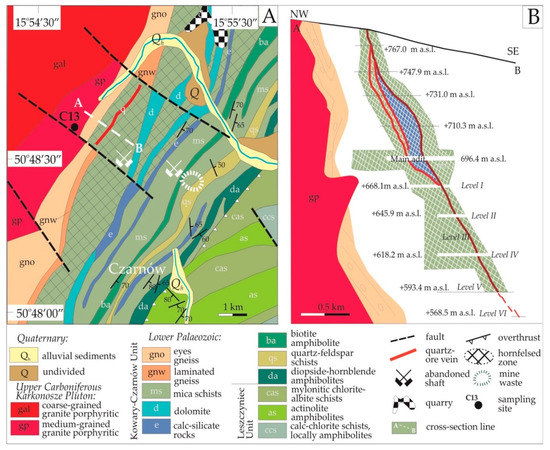 (A) Geological map of the Czarnów deposit area with location of the sampling site (C13) modified from [77]; (B) Schematic geological cross-section through the Czarnów As-polymetallic deposit.