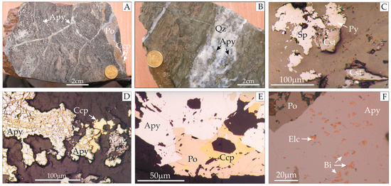 (A–F) Typical ore mineralization from the Czarnów As-polymetallic deposit: (A) macro-photographs of fractured massive pyrrhotite (Po) ore with chalcopyrite (Ccp) cemented by younger generation arsenopyrite (Apy); (B) Arsenopyrite (Apy) disseminated mineralization in quartz vein (Qz) hosted by calc-silicate skarn; (C) Photomicrograph under reflected light of fine-grained aggregates of cassiterite (Cst) and sphalerite (Sp), which contains disseminated pyrite (Py); (D) Highly fractured arsenopyrite cemented by chalcopyrite (Ccp), with associated magnetite (Mag); (E) finely crystalline sulfide aggregate of arsenopyrite (Apy), pyrrhotite (Po), and chalcopyrite (Ccp); (F) finely disseminated electrum (Elc) and native bismuth and bismuth minerals (Bi) hosted by massive arsenopyrite (Apy) and pyrrhotite ore (Po).
