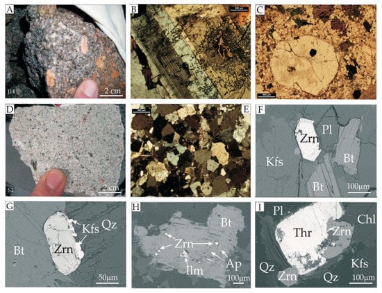 Photographs and photomicrographs of the studied igneous rocks from the KP and its eastern metamorphic cover (the Eastern Karkonosze). (A–C) coarse-grained porphyritic monzogranite (“central granite”); (A) sample J14 from the area of the Miedzianka polymetallic (-U) deposit; (B) Big crystal of twin K-feldspar. 2N (crossed nicols). Sample M12 from the Michałowice quarry; (C) phenocryst of quartz surrounded by sericite replacing plagioclase. Transmitted light, 1N (uncrossed nicols), Sample C13 from the area of the Czarnów polymetallic deposit; (D) fine-grained equigranular monzogranite (“ridge granite”) Sample S1 from the Szklarska Poręba Huta quarry, photograph and photomicrograph (E) in transmitted light, 2N; (F) Sample J15 from the area of the Miedzianka polymetallic (-U) deposit; zircon (Zrn) crystal in association with K-feldspar (Kfs), plagioclase (Pl) and biotite (Bt); (G) Sample J15; K-feldspar (Kfs) overgrowth on zircon crystallized between biotite (Bt) and quartz (Qz); (H) Sample C13; fine crystals of zircon (Zrn), apatite (Ap) and ilmenite (Ilm) in biotite (Bt); (I) Sample C13; zircon crystals intergrowing with thorite (Thr) surrounded by chlorite (Chl), quartz (Qz), K-feldspar (Kfs) and plagioclase (Pl).