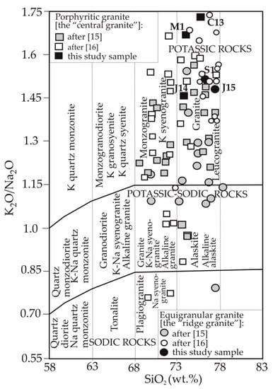 Classification of porphyritic (square) and equigranular (circle) granites from the Karkonosze Pluton on the diagram Na2O/K2O vs. SiO2; Data after [16,17] and this study.