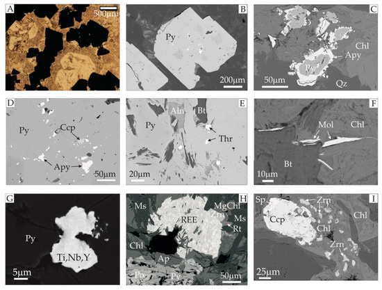 Ore mineralization from rhyolite porphyry Sample M2 from the central ore field in the abandoned Miedzianka Cu(-U) deposit. (A) Rhyolite porphyry from the Miedzianka deposit with disseminated pyrite (black) and quartz phenocrysts in a quartz-feldspar matrix. 1N, transmitted light; (B) automorphic pyrite (Py) crystals with fine inclusions of sulfides (white); (C) arsenopyrite (Apy) replacing medium-size pyrite; (D) numerous fine inclusions of arsenopyrite (Apy) and chalcopyrite (Ccp); (E) fine inclusions of thorite (Thr), allanite (Aln) and biotite (Bt) hosted by pyrite (Py); (F) fine blades of molybdenite between biotite (Bt) and chlorite (Chl) crystals; (G) very fine inclusion of an unidentified Ti, Nb, Y and REE-bearing mineral hosted by pyrite (Py); (H) aggregate of REE-bearing unidentified minerals associated with chlorite and other minerals within coarse-grained pegmatite intergrowths hosted by rhyolite porphyry. Abbreviations: REE—unidentified REE-bearing minerals with contents of Y, Ti, Nb, W, Th and U oxides; Ap—apatite; Chl and MgChl—Mg enriched chlorite; Ms—muscovite; Zrn—zircon; Rt—rutile. (I) chalcopyrite (Ccp) with sphalerite (Sp) associated with chlorite (Chl) and numerous fine-grained zircons (Zrn).