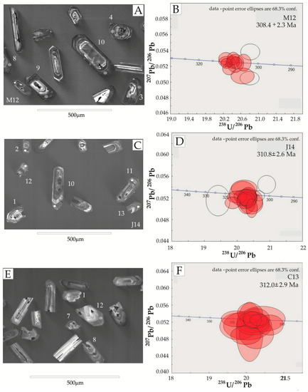 Zircon U-Pb dating of five granitoids from the central region and eastern margin of the Variscan Karkonosze Pluton, and a rhyolite dyke cutting the metamorphosed cover sequence at the Miedzianka Cu -(U) deposit, yields 206Pb/238U ages in the range from 312.0 ± 2.9 to 300.7 ± 2.4 Ma (Figure 12). All the igneous rocks investigated came from zones containing a variety of ore mineralization, the genesis of which was associated mainly with the development of pneumatolitic-hydrothermal and contact-metasomatic processes connected with magmatic evolution of the KP [31]. The oldest dated rocks were two monzogranite porphyries from the direct contact zone between the granitoids and mineral deposits at Czarnów (312.0 ± 2.9 Ma) and Miedzianka (310.8 ± 2.6 Ma). A third sample of coarse monzogranite porphyry from the granite quarry at Michałowice yielded 206Pb/238U age of 308.4 ± 2.3 Ma. The ages of equigranular monzogranite samples collected from the area close to the Miedzianka deposit and from the granite quarry at Szklarska Poręba Huta were 309.5 ± 4.5 and 306.9 ± 3.0 Ma, respectively.