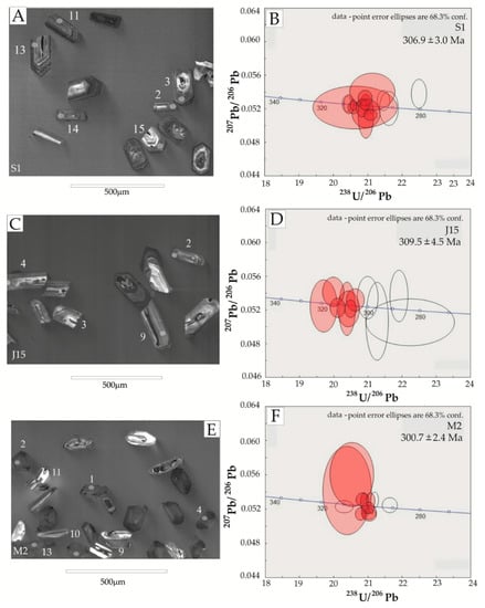 Cathodoluminescence images of selected zircon grains (ellipses show analysis locations) and concordia diagrams showing SHRIMP zircon U-Pb analyses (open symbols–analyses not included in the age calculations) of igneous rocks from the area of the KP and its eastern metamorphic cover. (A,B) equigranular granite, Sample S1, from the Szklarska Poręba Huta granite quarry; (C,D) equigranular granite, Sample J15, from the area of the Miedzianka deposit; (E,F) rhyolite porphyry, Sample M2, from the Miedzianka Cu(-U) deposit.