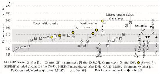 Comparison of the U-Pb data with Re-Os dating of sulfides (mainly molybdenites) from the same sites in the Karkonosze massif and in the Eastern Karkonosze [5,6,87,88] (Figure 12) provides insights into the mineralization process. Comparison with the molybdenite data reveals both age similarities and small differences, recognizing that two different radiometric clocks, U-Pb and Re-Os, are recording the timing of crystallization of two different minerals in a complex magmatic setting.