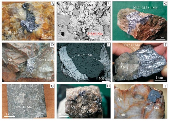 (A–I) Photographs of molybdenites and arsenopyrite from the Karkonosze Pluton and its eastern metamorphic cover with its Re-Os isotopic ages after [5,6,87]. (A) Molybdenite (Mol) plates disseminated in pegmatitic intergrowths of quartz (Qz) and K-feldspar, Szklarska Poręba Huta granite quarry; (B) hexahedral molybdenite (Mol) plates in association with chalcopyrite (Ccp), abandoned Michałowice quarry. BSEI; (C) molybdenite (Mol) coat-like aggregate in skarn, abandoned Kowary Fe-U mine; (D) molybdenite (Mol) crystal aggregate hosted by quartz-K-feldspar rock, Kowary Fe-U mine; (E) fragment of sample from (D) macrophotography with molybdenite (Mol) as separate bladed crystals under reflected light; (F) molybdenite (Mol) crusty aggregates in quartz (Qz) vein, Miedzianka Cu-(U) deposit; (G) massive Co-bearing arsenopyrite in (Apy) quartz vein, Czarnów As-polymetallic deposit; (H) fine molybdenite (Mol) crystals intergrown with vein quartz (Qz), Szklarska Poręba Huta granite quarry; (I) molybdenite (Mol) in fractured quartz (Qz) vein with rusty Fe ochre along fractures, Łomnica Górna abandoned granite quarry.