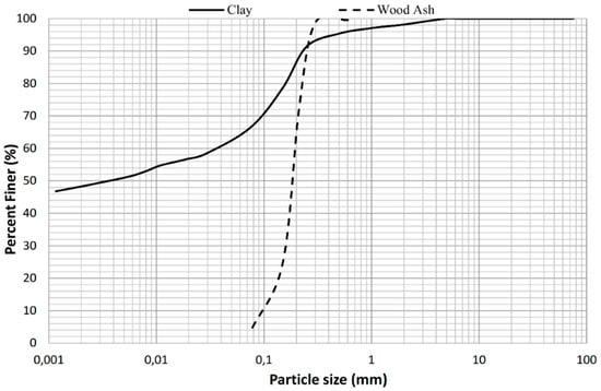 The WA used in this study was obtained from the remnants of pruned and burned olive trees. The particle size distribution is shown in Figure 1, along with that of the clay. The chemical analysis (standard) results are shown in Table 2. This wood-ash consists mainly of calcite and silica. Similar findings were confirmed on the EDX analysis shown in supplementary file (see Figure S3). The specific gravity of wood-ash was determined in accordance with ASTM C188-17 []. The specific gravity can vary depending on the source and the heat of combustion, as explained by Naik et al. []. Therefore, specific gravity tests were performed on every lot of provided wood-ash, and an average value of 1.7 was taken into consideration (variation of Gs < 0.02).